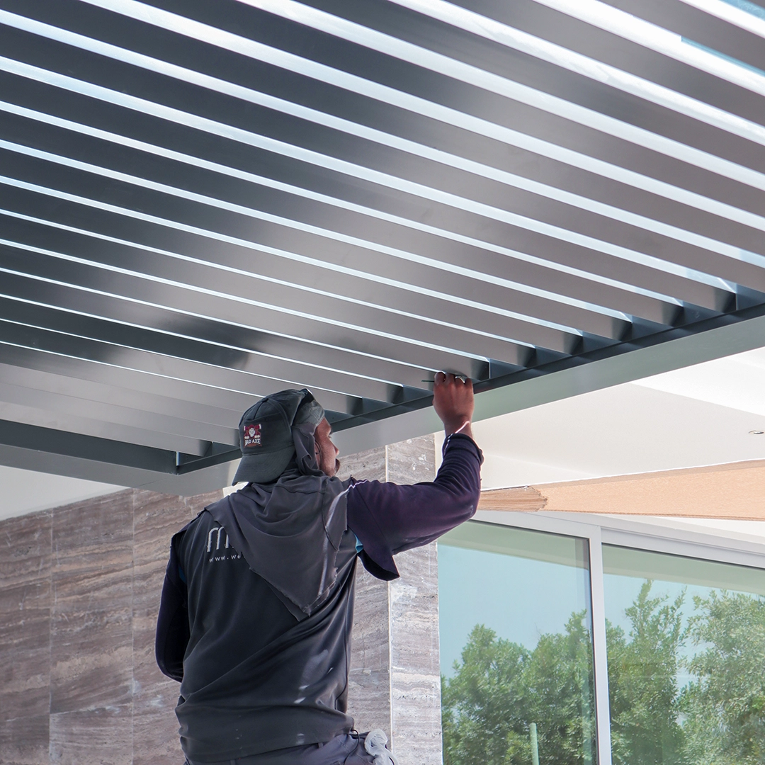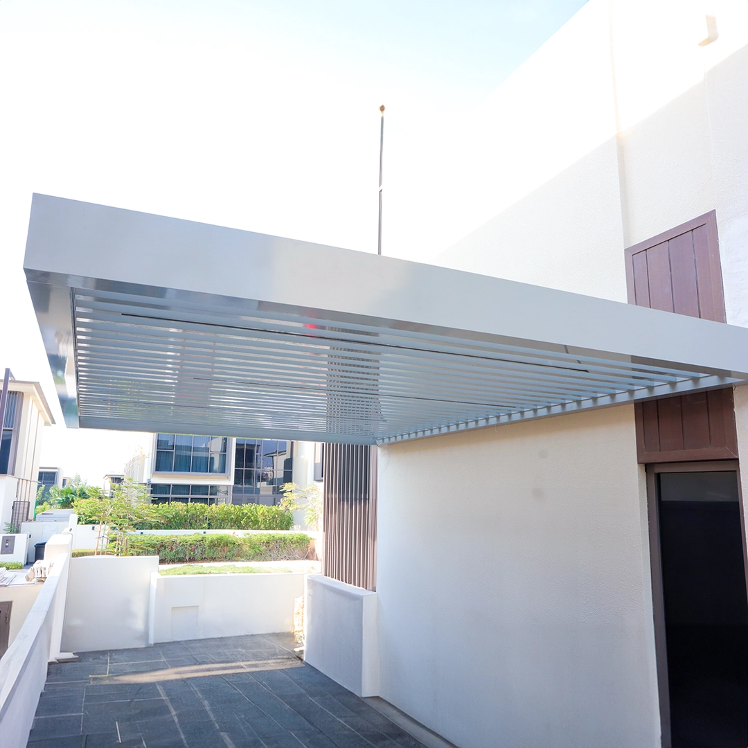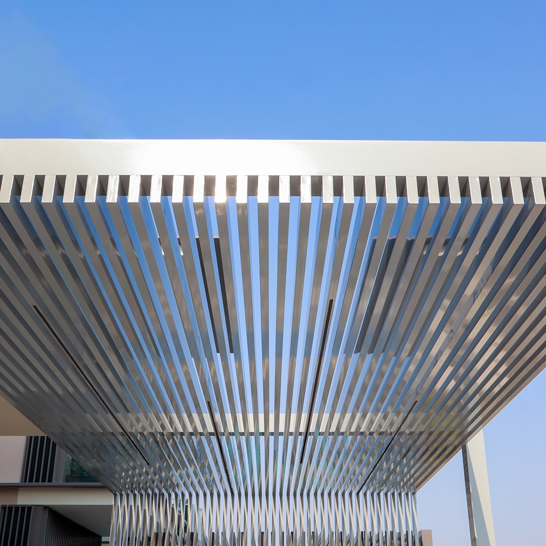 Aluminum Decorative Pergola, custom-made and complete with Stainless Steel Rain Curtain and Strip Lights and Heat-Treated Coating at Dubai Hills Signature Villas.